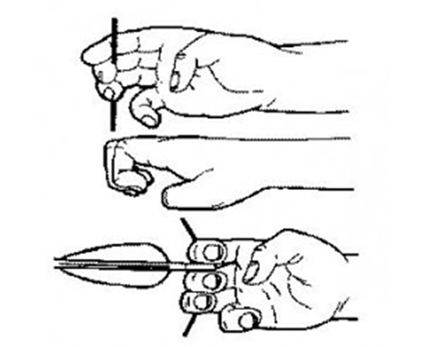 - Указательный палец держите над стрелой, безымянный и средний – под ней.