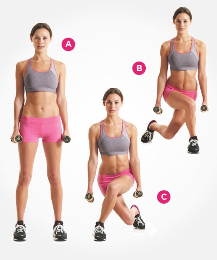 Плие. Это глубокие приседания с гантелей, акцентирующие нагрузку на приводящие мышцы бедра. Ноги ставятся шире плеч, носки разворачиваются в стороны. Держите гантель обеими руками перед собой. Приседайте, сохраняя спину прямой, ноги разведены, бедра параллельны полу. Вернитесь в исходное положение.