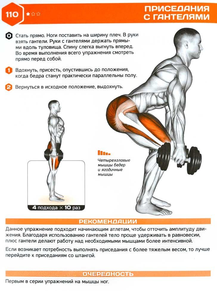 Развитие силы ног и ягодиц | Квадрицепсы, бицепсы бедра, ягодичные мышцы, икры | Держите спину прямой, грудью вперед, взгляд направлен вперед. Гантели держите вдоль тела, ладонями обращенными друг к другу. Приседайте до параллели бедер с полом или чуть ниже, контролируя движение. |